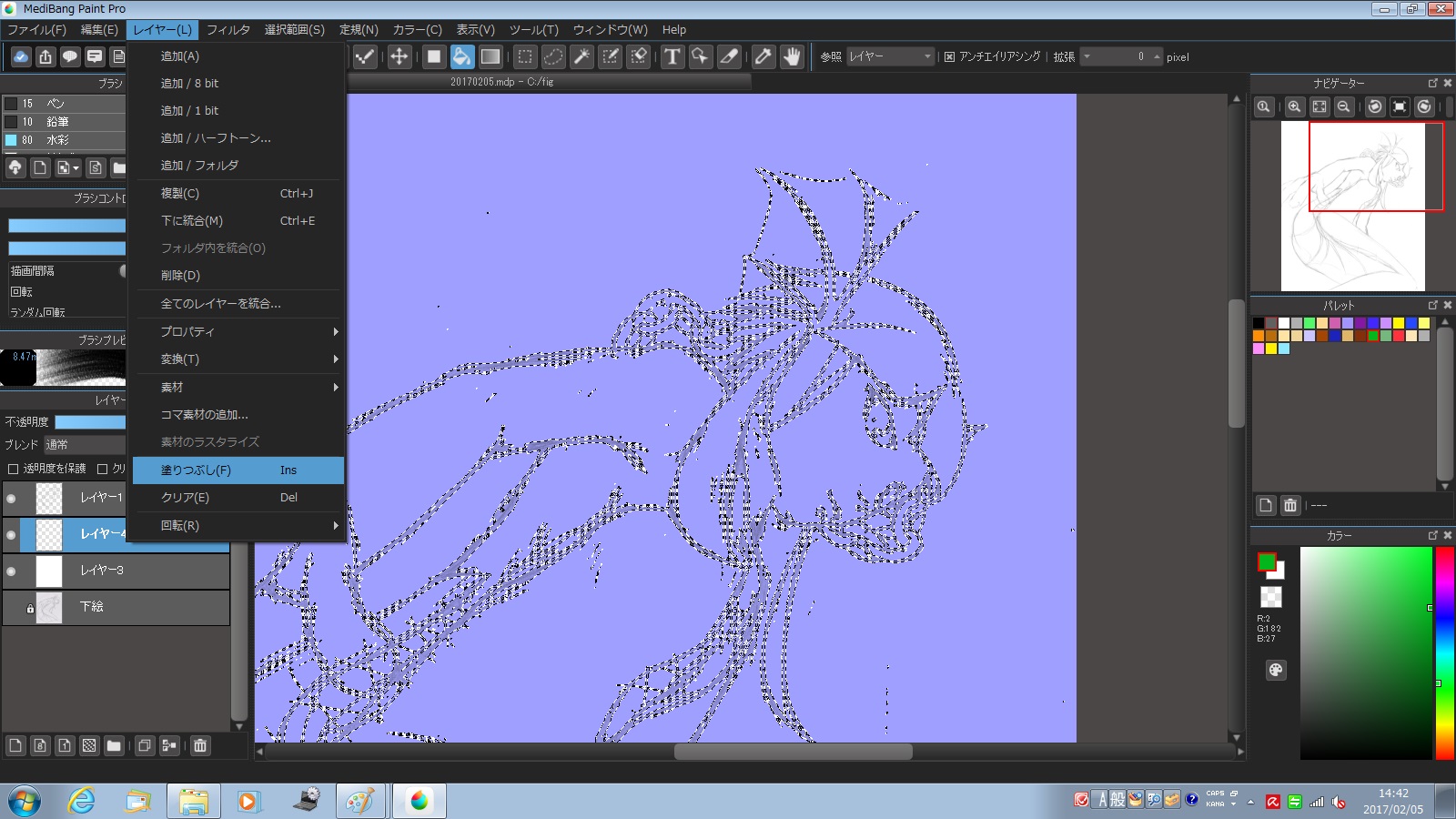 後は、別の通常レイヤーを準備して、レイヤー>塗りつぶし、で好きな色で塗りつぶします。