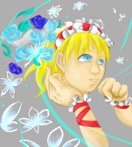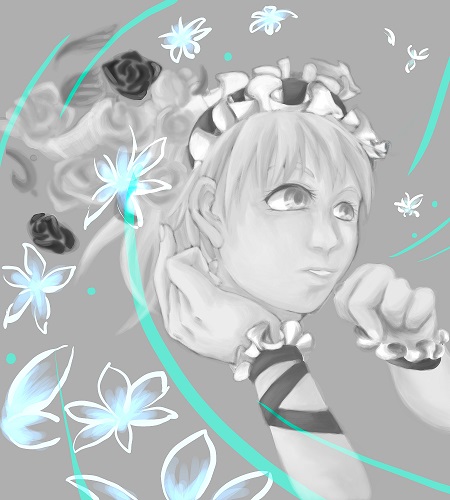ヘアバンドの塗りこんだレイヤーだけ8bitにしてみたら、意外と上に描いた花が綺麗に見えた一点。